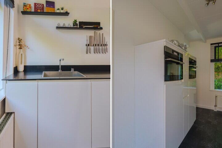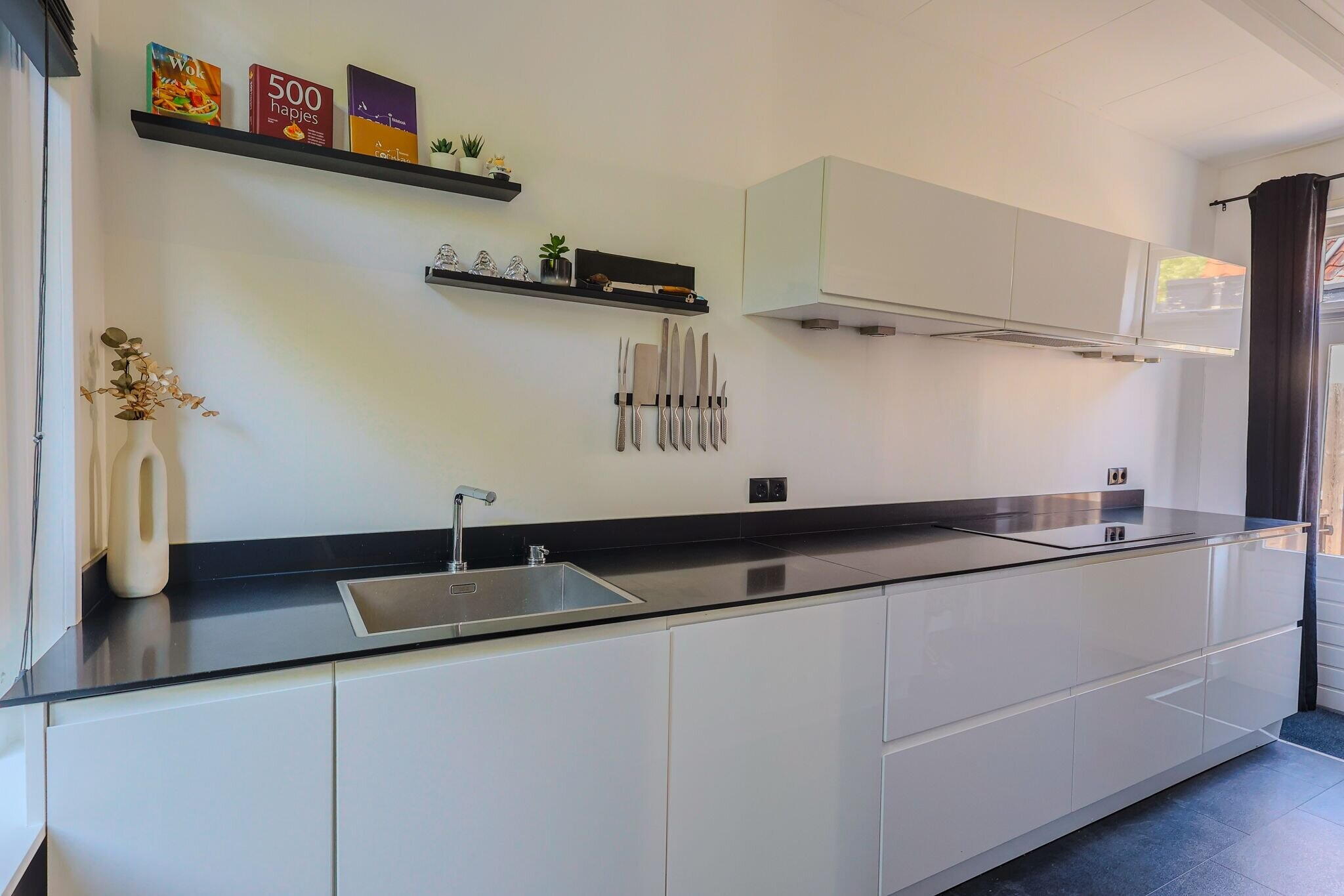 Entree in de hal voorzien van meterkast, garderobe en de trapopgang. Bij binnenkomst vind je de woonkamer met hoog balkenplafond en akoestisch wandpaneel direct aan de rechterzijde. In 2021 zijn er vloerbalken vernieuwd én is de vloer voorzien van isolatie – een comfortabele en duurzame verbetering. De ruimte is praktisch ingedeeld, met aan de voorzijde plek voor een gezellige eethoek en aan de achterzijde een sfeervol zitgedeelte. De keuken is in 2021 geplaatst en voorzien van alle gemakken zoals een inductiekookplaat, een koelkast, vriezer, een combi hetelucht/magnetron oven, een combi hetelucht/stoomoven, vaatwasser en volop opbergruimte. Van hieruit toegang tot de tuin. Ook de badkamer is in 2021 vernieuwd en voorzien van een nette inrichting. De ruimte is uitgerust met een wastafel met meubel, een toilet, toiletkast en een douchecabine. Daarnaast is hier ook de cv-ketel geplaatst.