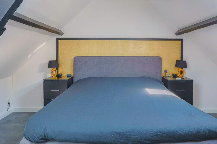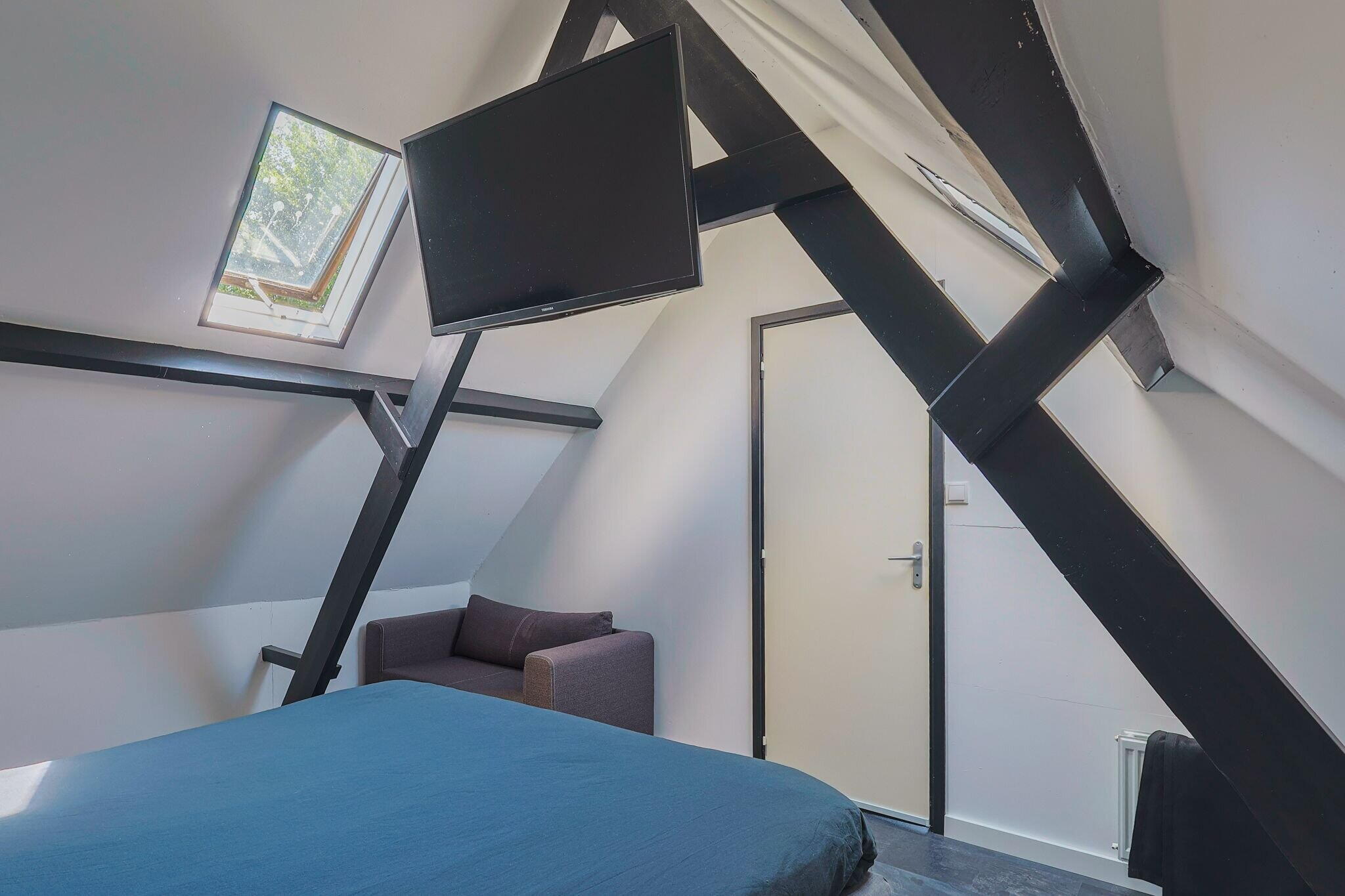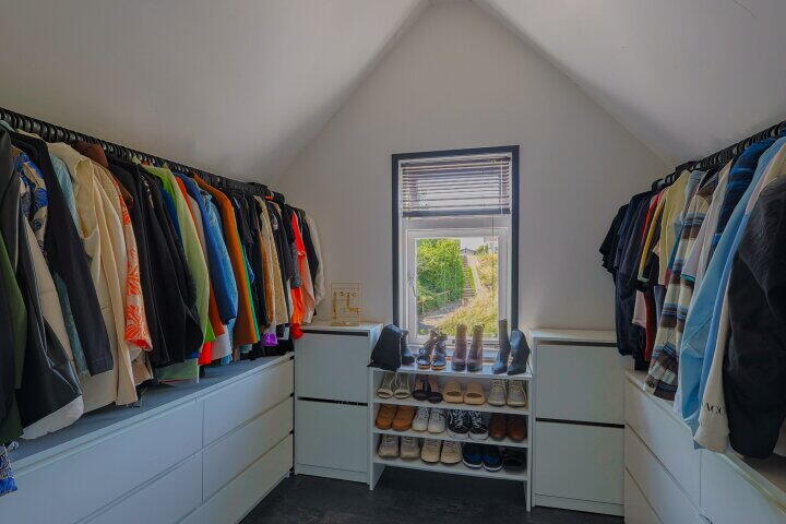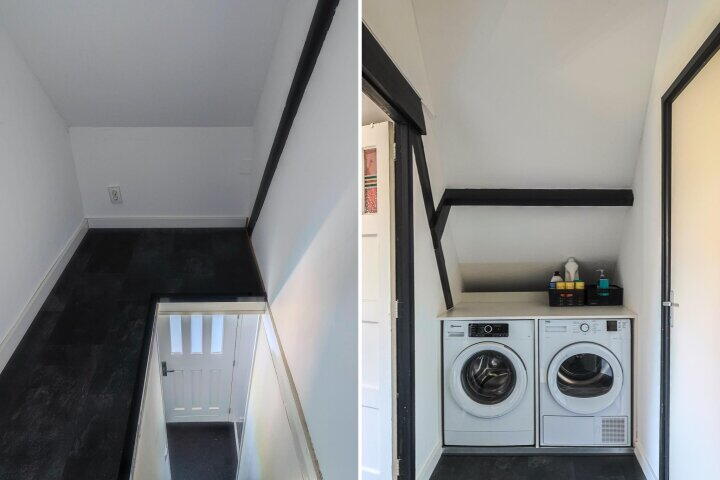 Op de overloop zijn de aansluitingen voor de wasmachine en droger handig weggewerkt en zijn beide slaapkamers toegankelijk. De eerste slaapkamer, momenteel in gebruik als kleedruimte. De kamer is afsluitbaar met een prachtige glas-in-looddeur, wat extra karakter en sfeer toevoegt. De grootste slaapkamer ligt aan de rechterzijde en beschikt over twee dakramen die zorgen voor veel natuurlijk licht. In deze kamer is de houten draagconstructie van het dak zichtbaar gebleven, wat perfect past bij de karakteristieke uitstraling van de woning.